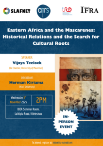 Accueillie à l’IFRA Nairobi, Vijaya TEELOCK a présenté une conférence sur les relations historiques entre l’Afrique de l’Est et les Mascareignes, mettant en lumière les héritages culturels et les mémoires partagées.
